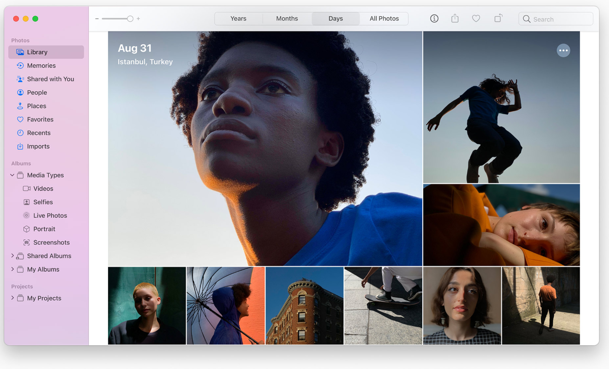 Для организации фото можно использовать альбомы (папок вообще нет). Есть удобный поиск по ключевым словам — например, напишите «дерево», и прога найдёт в вашем архиве все фотографии с изображением деревьев. Также есть опция группировки фоток по лицам.