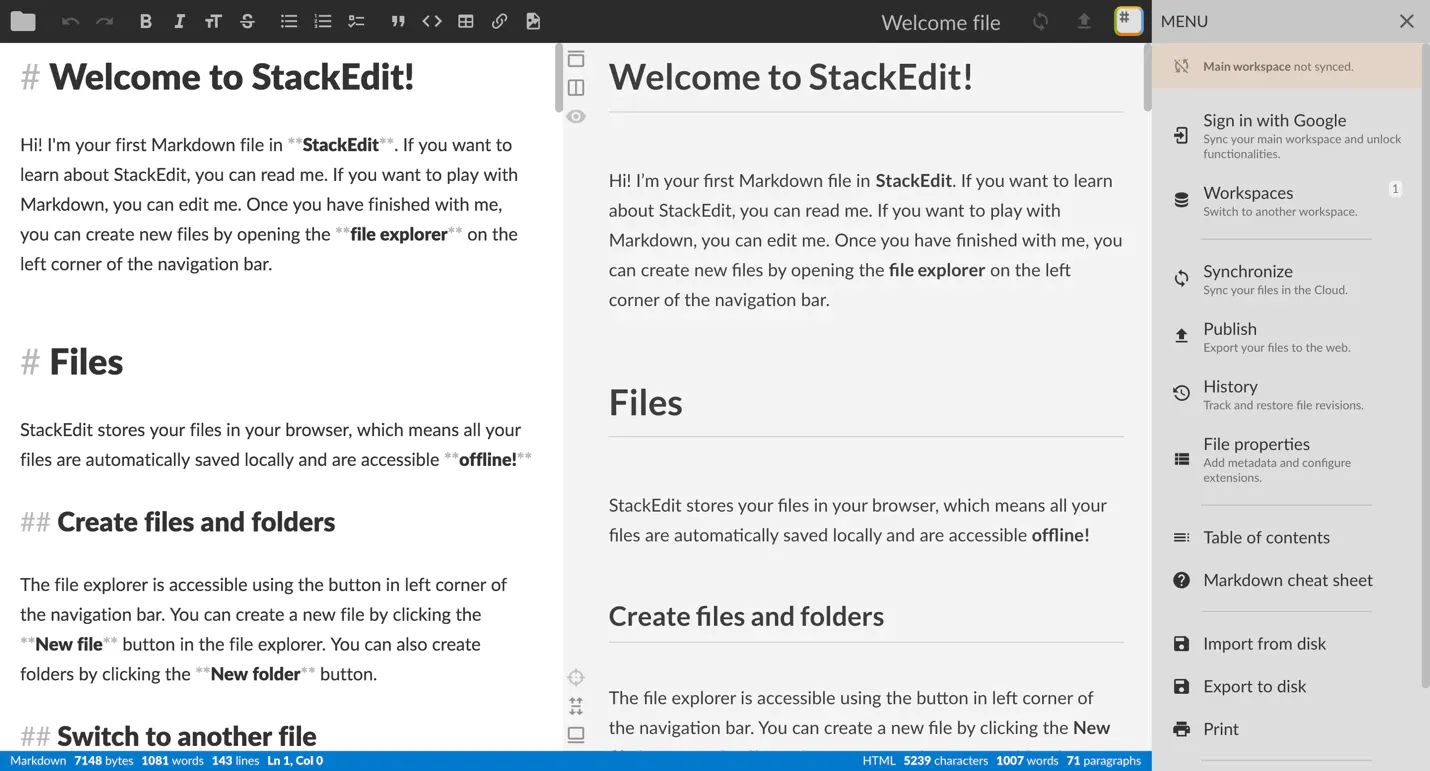 Отличный онлайновый редактор Markdown с удобной панелью инструментов для форматирования текста и возможностью видеть, как будет выглядеть работа без разметки.