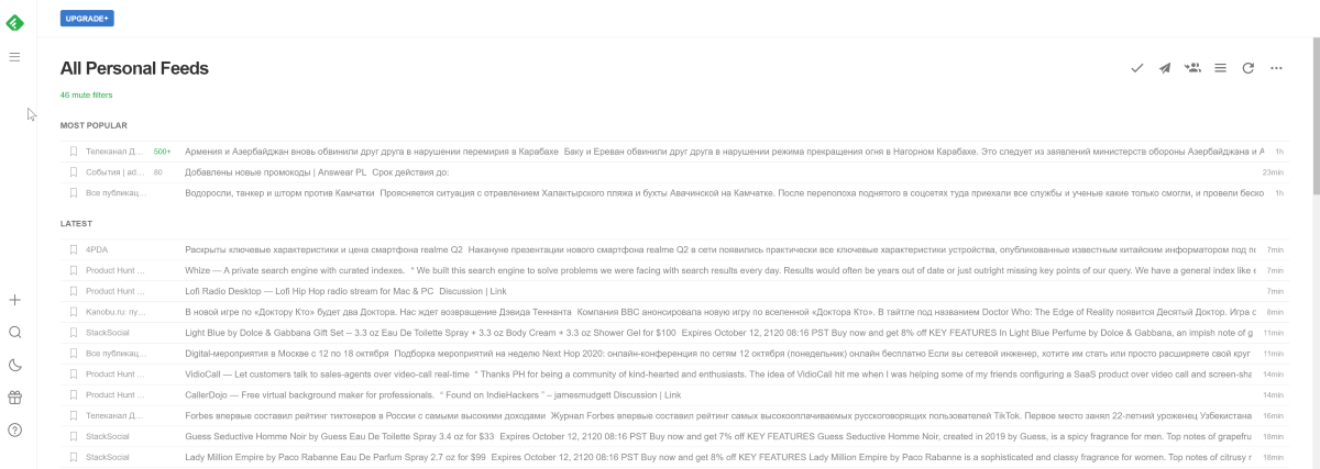 С бесплатным тарифным планом Feedly вы получите большинство функций, которые необходимы обычным читателям. Отслеживайте до 100 источников, сортируйте по тематическим категориям сайты, на которые вы подписаны, смотрите видео на YouTube и читайте полнотекстовые статьи (если они доступны) в минималистичном режиме, не отвлекающем внимание. Кроме того, Feedly предлагает мобильные приложения для устройств Android и iOS, поэтому вы можете легко получать доступ к подпискам как дома, так и в дороге.