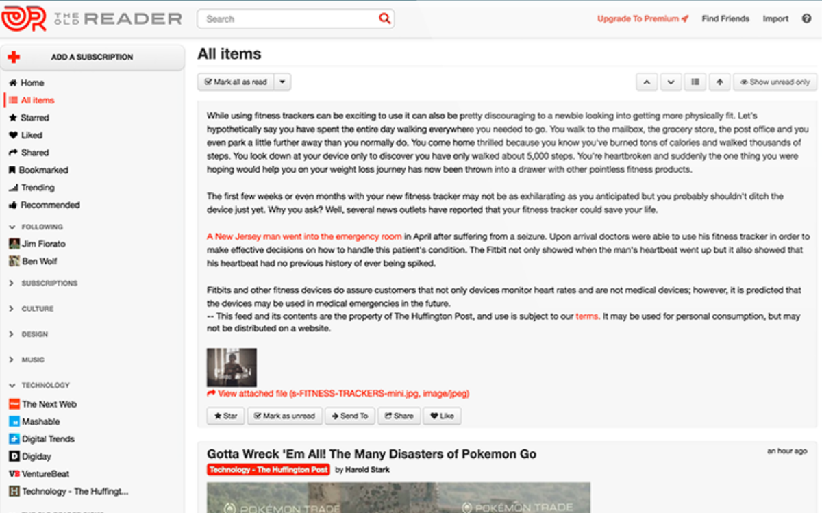 Если вам и вашим друзьям нравится один и тот же тип контента, The Old Reader позволит вам делиться своими рекомендациями друг с другом. Просто подключите свою учётную запись Facebook или Google, подпишитесь на друзей, у которых тоже есть учётные записи, и The Old Reader покажет вам рекомендованный ими контент.