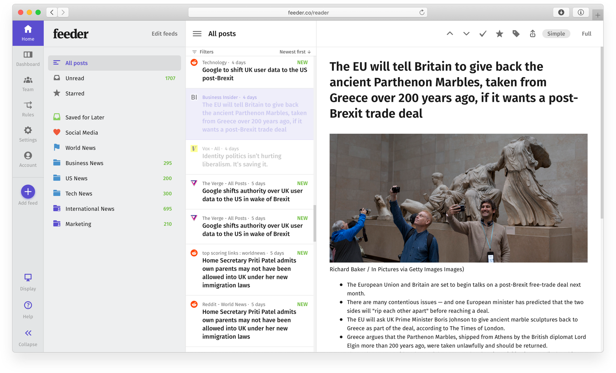 Если всё, что вам действительно нужно, — это лишённое излишеств место, где можно было бы отслеживать и собирать интересующий вас контент, Feedreader — это инструмент для вас. Это базовая веб-программа для чтения RSS без рекламы, позволяющая подписываться на каналы, просматривать контент в двух представлениях (развёрнутом или свёрнутом) и отмечать интересующие вас элементы, чтобы просмотреть их позже.