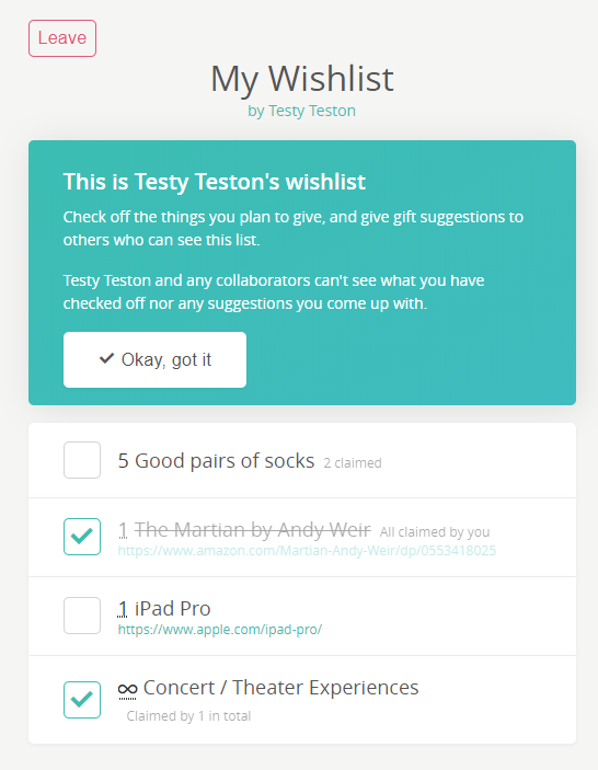 Всё просто. Создаёте список, добавляете товары, делитесь им со всем миром. Друзья могут помечать те вещи, которые они планируют купить. Такие отметки не видны составителю списка. А остальные смогут увидеть, что уже куплено, и не прийти на праздник с двумя одинаковыми подарками.