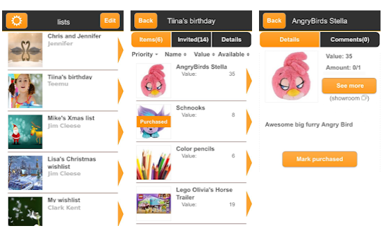 В списки можно добавлять товары из любого магазина или из общих списков других пользователей. Ваши друзья могут помечать товары, которые хотят подарить, или делать денежные взносы на них.