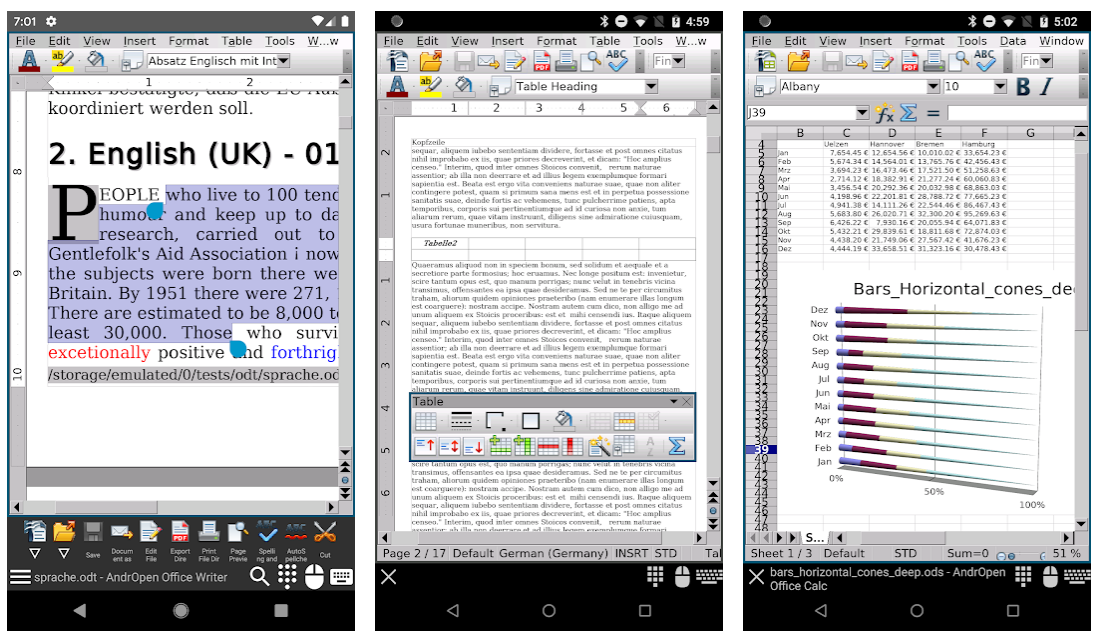 AndrOpen Office — это первая официальная мобильная версия OpenOffice. Приложение включает в себя: текстовый редактор, инструменты для работы с электронными таблицами и презентациями и некоторые дополнительные функции. С его помощью вы можете даже рисовать и считать. Но мы-то ведём речь об электронных таблицах.