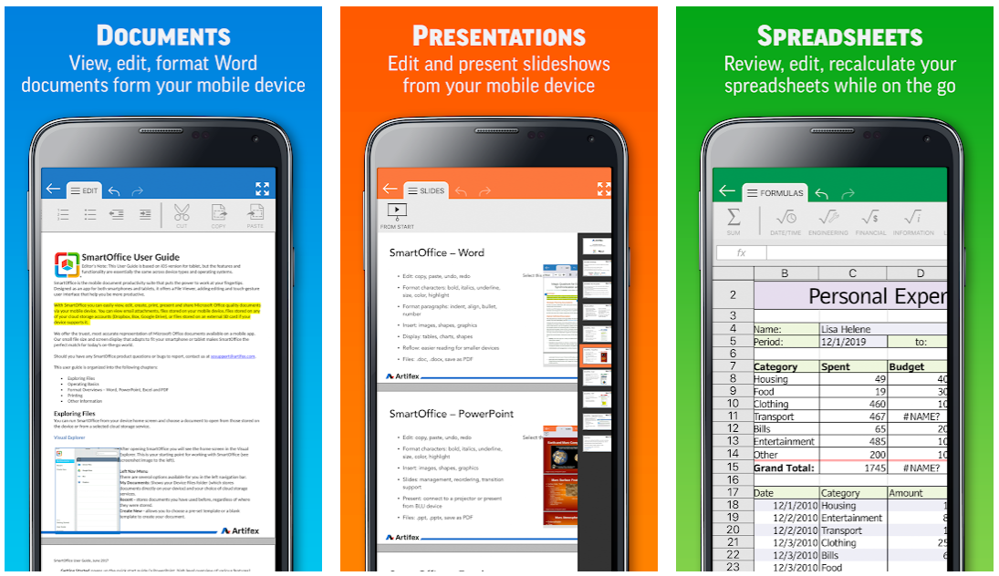 Docs To Go — неплохой вариант мобильного офиса. Он включает в себя наиболее значимые элементы, в том числе инструменты для работы с текстами, презентациями и электронными таблицами. Последний поддерживает файлы Microsoft Office Excel, легко настраивается и пригоден для многих относительно простых задач. Электронные таблицы от Docs To Go могут похвастаться наличием 111 различных функций, включая различные настройки столбцов и сортировку.