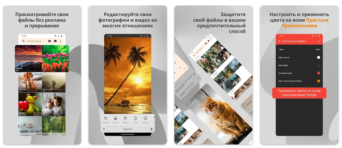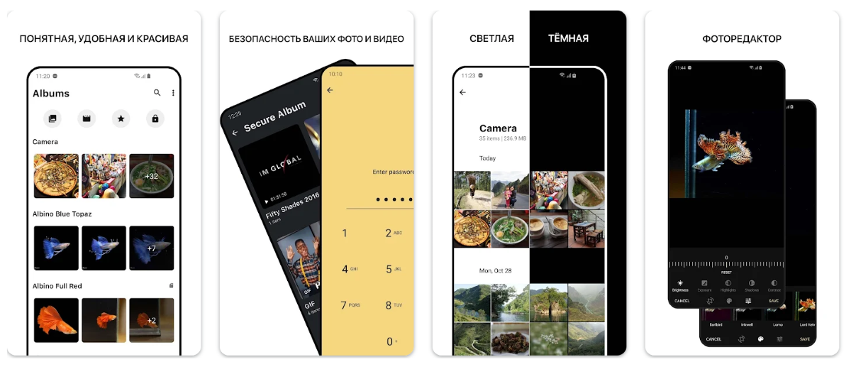 Это простая галерея, которая не требует подключения к интернету и прочих разрешений. Есть редактор для базовой обработки фотографий и видео, поиск, возможность упорядочивать свою коллекцию и добавлять снимки в избранное.