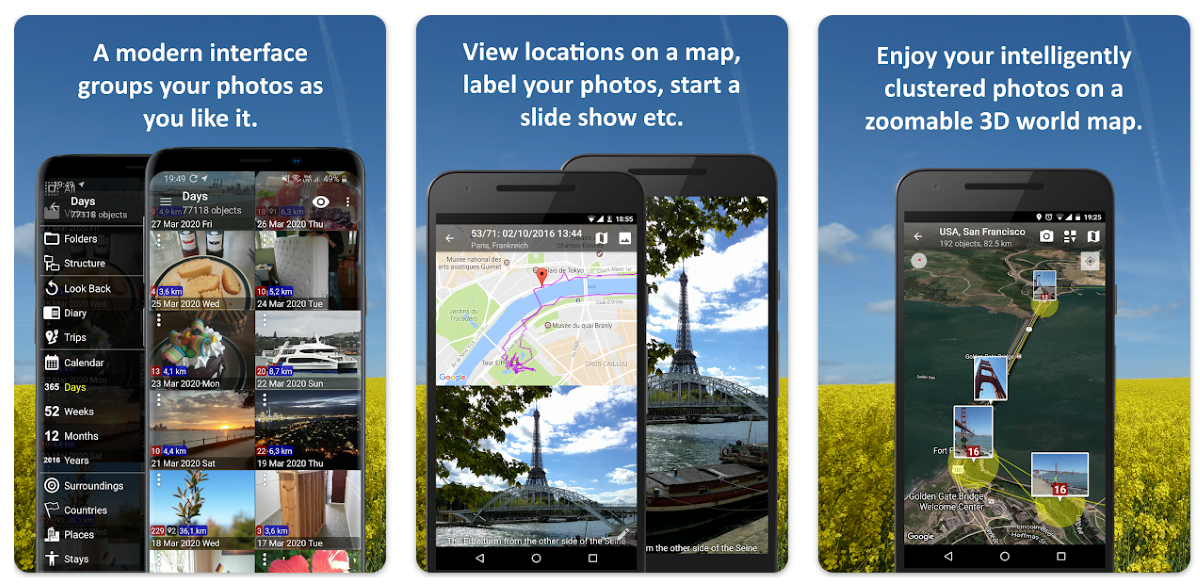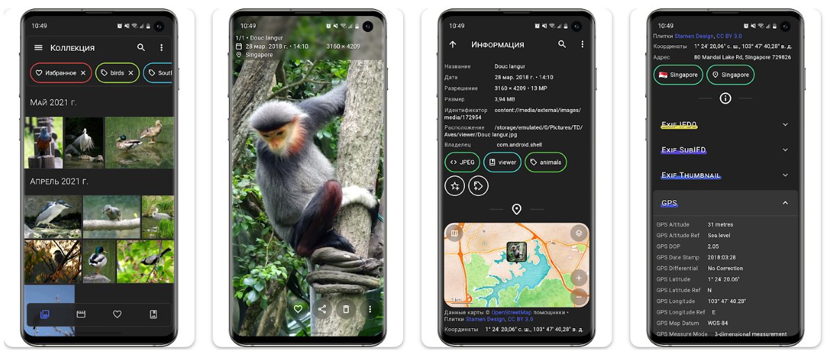 Это одна из самых мощных альтернатив стандартной галерее для Android. Приложение бесплатное, опенсорсное и имеет минималистичный и чистый интерфейс. Поддерживает различные форматы файлов, включая такие редкие, как TIFF, SVG и другие (видеофайлы тоже прекрасно открывает).