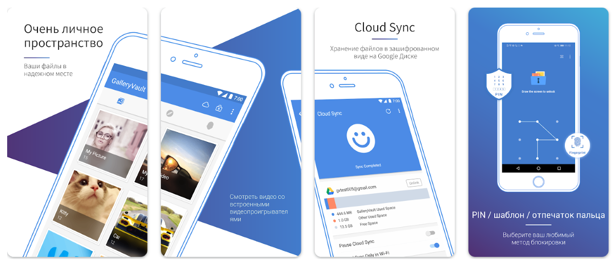 Также вы сможете защитить свои фото и видео пин-кодом, графическим ключом или отпечатком пальца. Кроме того, если вы скроете свои файлы, они будут ещё и зашифрованы.