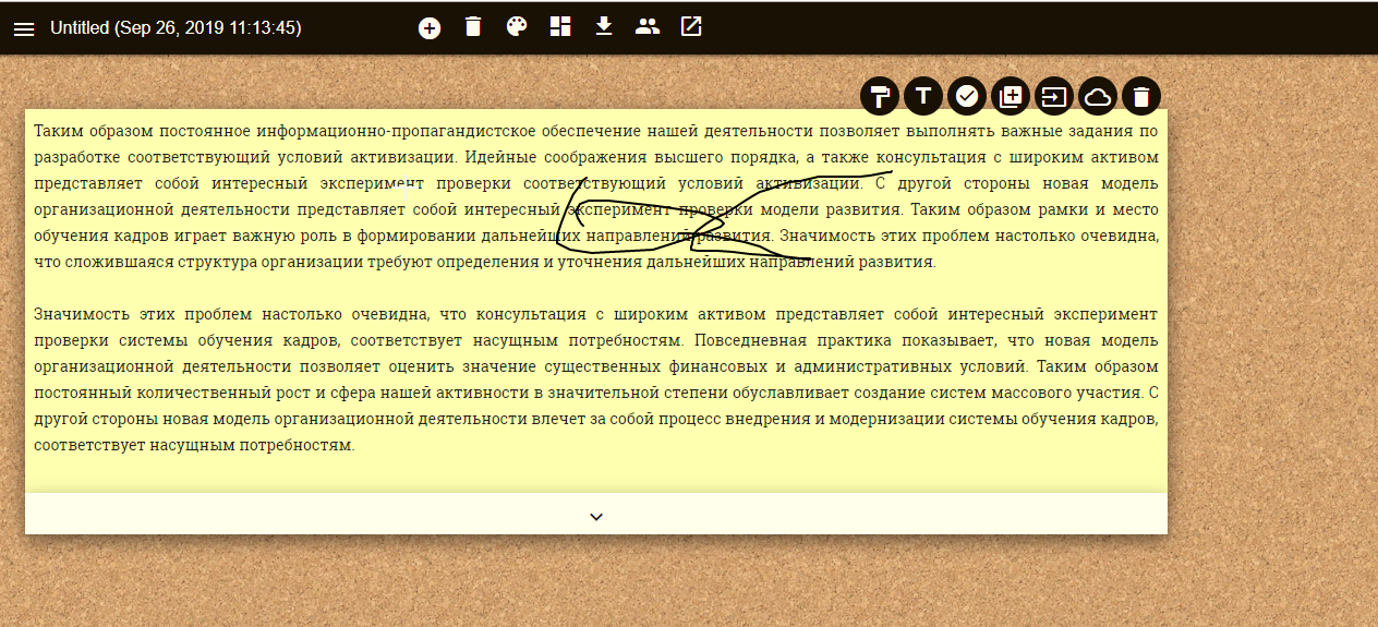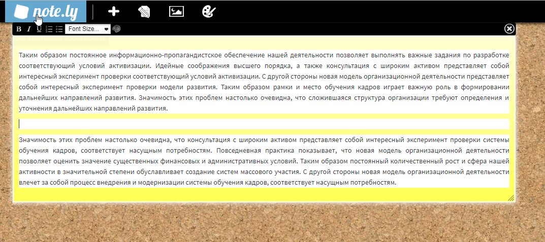 Note.ly выглядит как пробковая доска, на которой можно «крепить» свои записки. Для записок доступно форматирование текста, вставка изображений, изменения цвета заметки и фона.