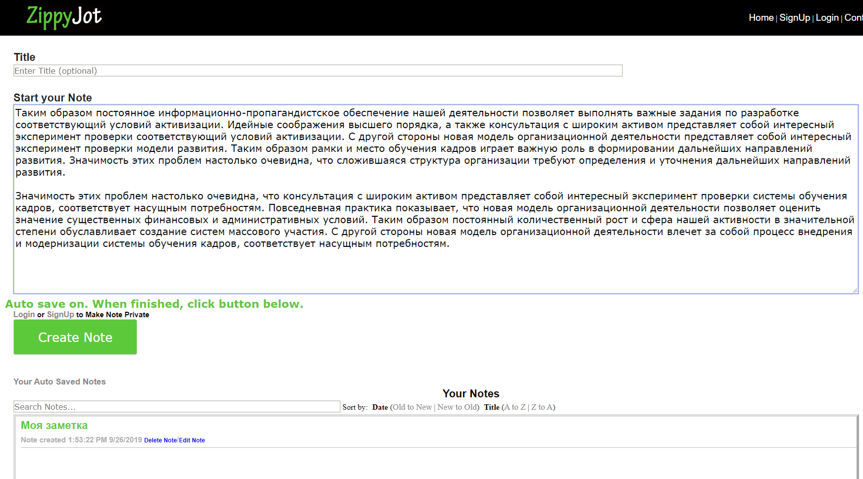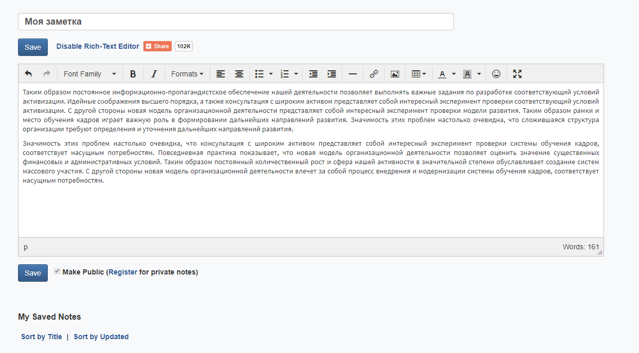 Минусы. Не очень очевидный интерфейс. Без регистрации нельзя поделиться заметкой.