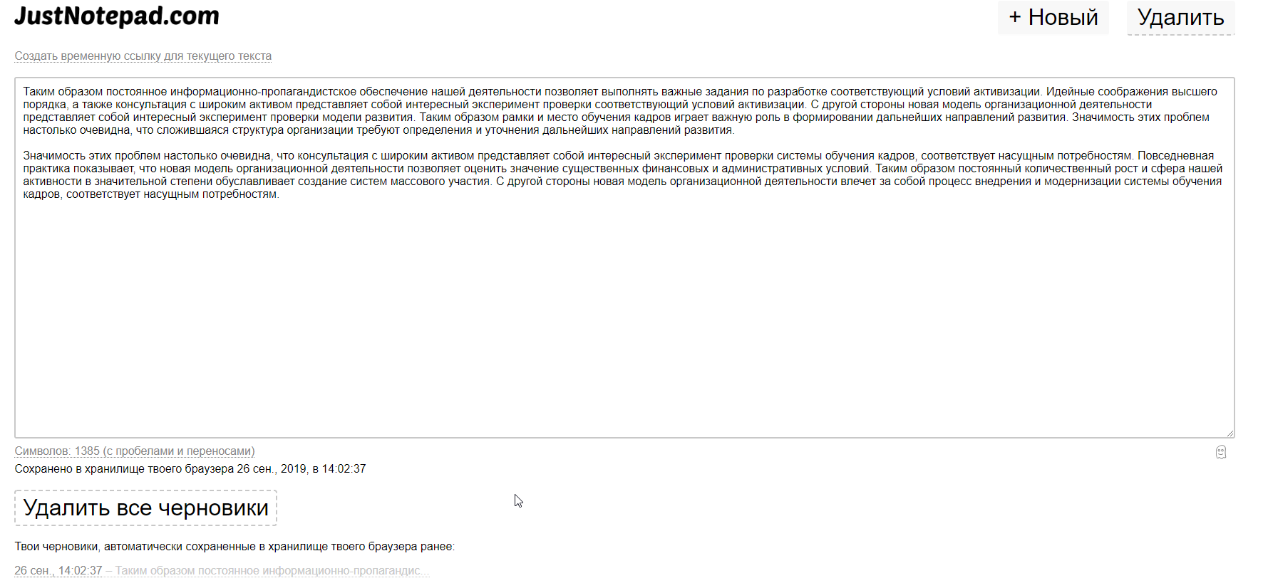 Justnotepad очень простой сервис для хранения заметок без форматирования. Заметками можно делиться с помощью временных ссылок. Все заметки хранятся в виде черновиков.
