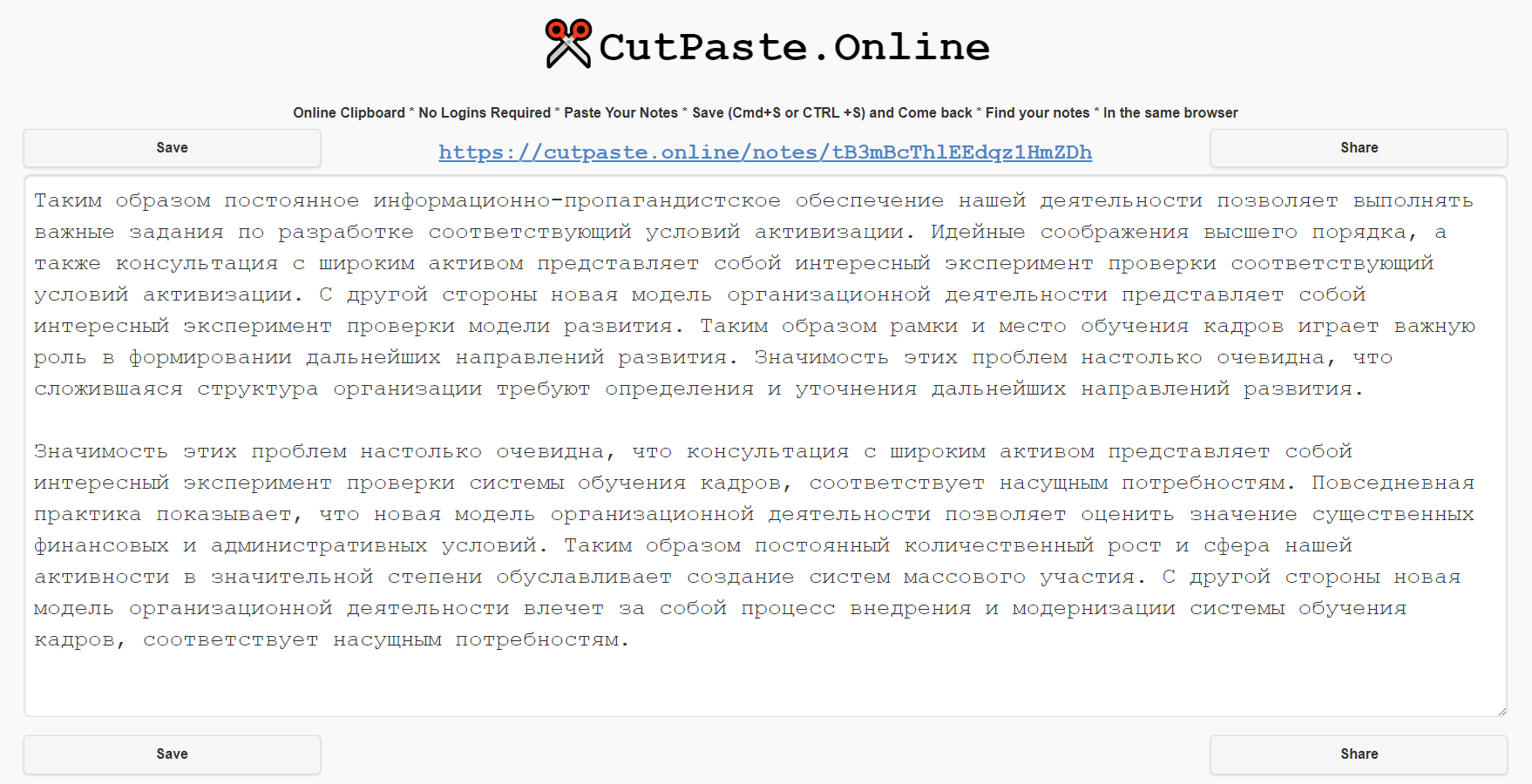 CutPaste полностью оправдывает своё название. Скопировали текст, вставили в сервис, получили ссылку. Всё.