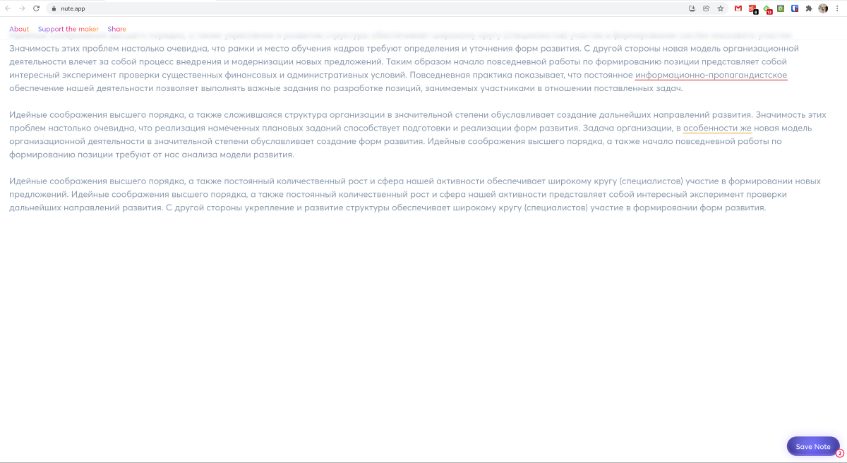 Максимально простой сервис для создания заметок. Здесь есть только поле для ввода текста и кнопка Сохранить заметку. При нажатии на неё заметка сохраняется в формате .txt.