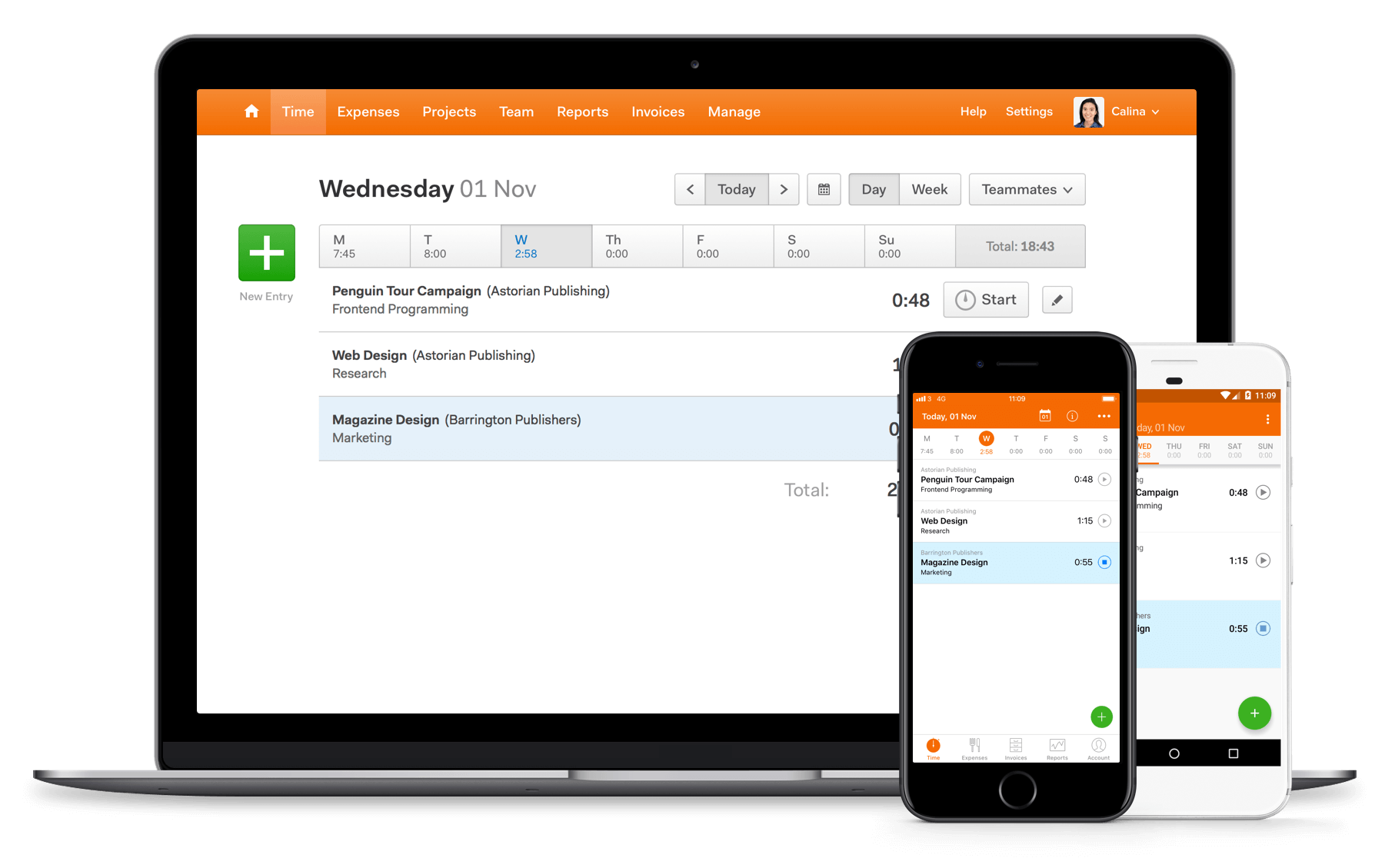 При постановке новой цели всегда имеются различные методы фиксации израсходованного на неё времени. Есть возможность воспользоваться веб-интерфейсом FreshBooks, расширением Chrome, кнопками, встроенными в иные программы (Asana, Boomr, Basecamp), а также мобильным приложением. Это залог колоссальной гибкости. Допустим, вы находитесь на переговорах, и не можете воспользоваться ноутбуком, и всё же можете следить за временем через мобильное приложение. При применении веб-приложения текущие часы двигаются за вами от листа к листу.