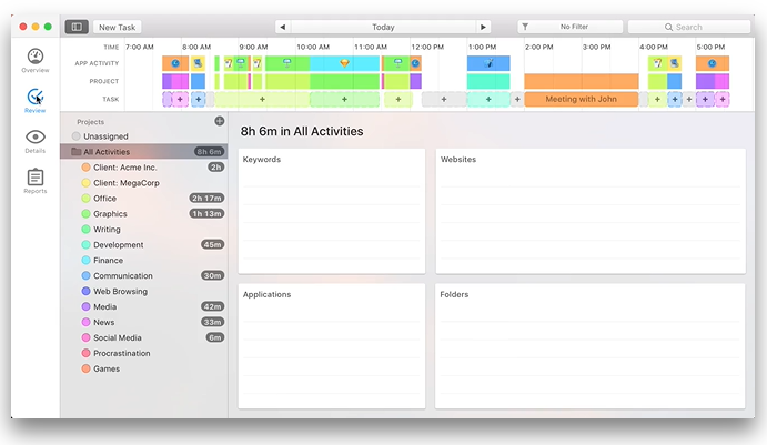 Также доступна функция ручного добавления офлайн-мероприятий (для владельцев пакета Professional). А ещё возможен запуск ручных задач при помощи таймера. Когда завершается день, и вы знакомитесь с содержимым журналов, появляется возможность свободно перенести проекты на временную шкалу — для оперативной классификации различных блоков активности.
