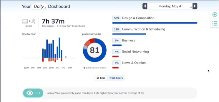 Ещё RescueTime состоит из блокировщика веб-порталов — FocusTime. Его задача — блокировка отвлекающих порталов, когда вы занимаетесь какой-то важной деятельностью. Доступна и настройка персональных часов для работы — таким образом, произойдёт отделение рабочего времени от свободного. Порой программа может выслать сообщение о том, что вы чересчур заработались, — расценивайте это как защиту от перегруза. При постановке определённых задач приложение позволит вам их решить с предоставлением актуальных уведомлений, отслеживанием задач в отчётах (еженедельного типа).