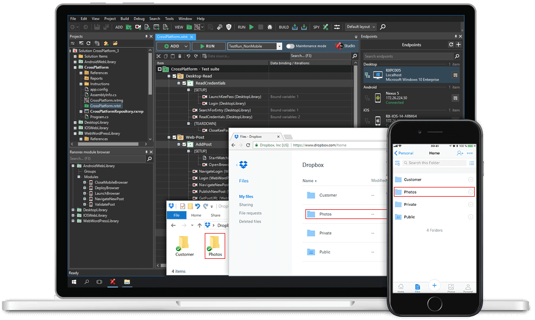 Ranorex предназначен для настройки и выполнения сценариев автоматизированного тестирования. Данный инструмент позволяет распознавать объекты графического интерфейса, применять многоразовые тестовые сценарии, записывать и воспроизводить этапы проверки тестируемого программного обеспечения. Кроме того, Ranorex предлагает бесскриптовое тестирование.