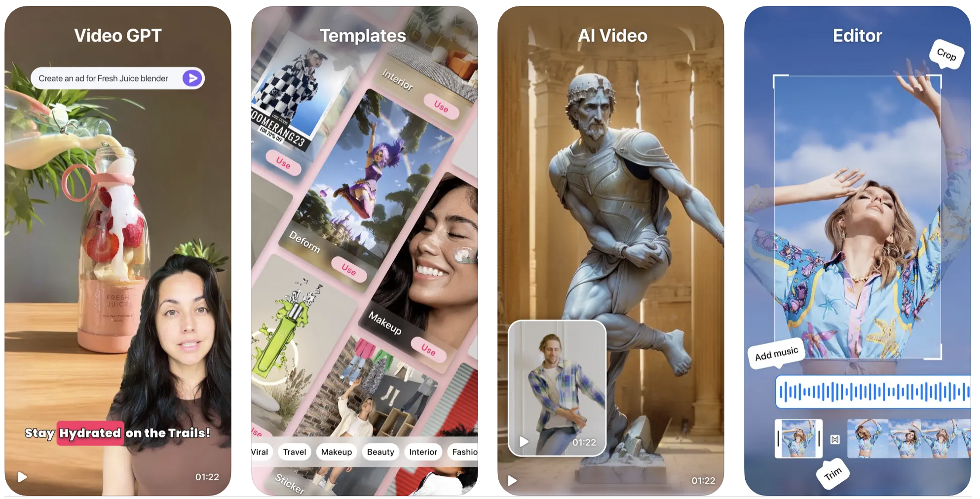 Простой в использовании видеоредактор поможет в один тап создать красивый и оригинальный рилс для соцсетей, YouTube или TikTok. Здесь тоже всю работу берёт на себя ИИ. Вам нужно лишь загрузить видео (или записать его прямо в приложении), а программа сама добавит подходящую музыку и эффекты. Также вы можете посмотреть трендовые рилсы и попробовать повторить их.