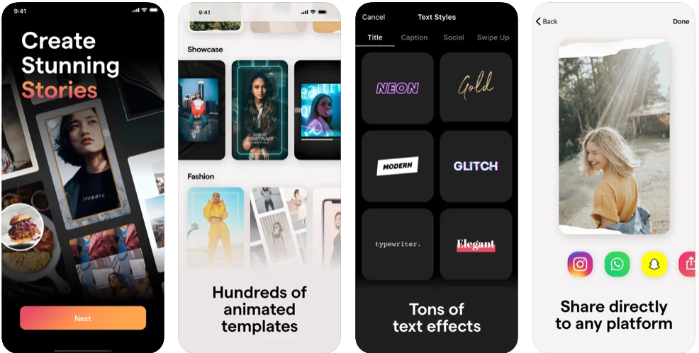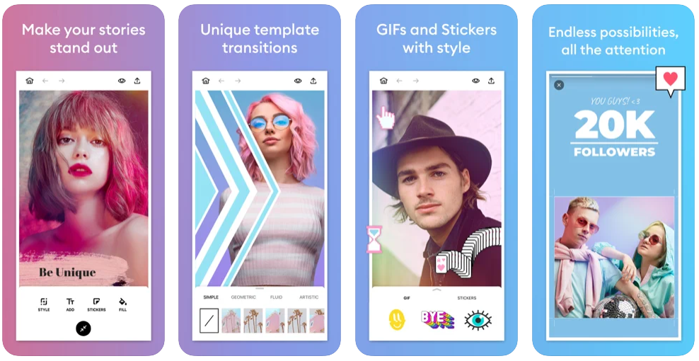 Это одно из лучших приложений для добавления крутых динамических переходов между слайдами. Используя огромный набор шаблонов и переходы, вы сможете объединять 15-секундные клипы для создания таких сториз, которые захочется досмотреть до конца.