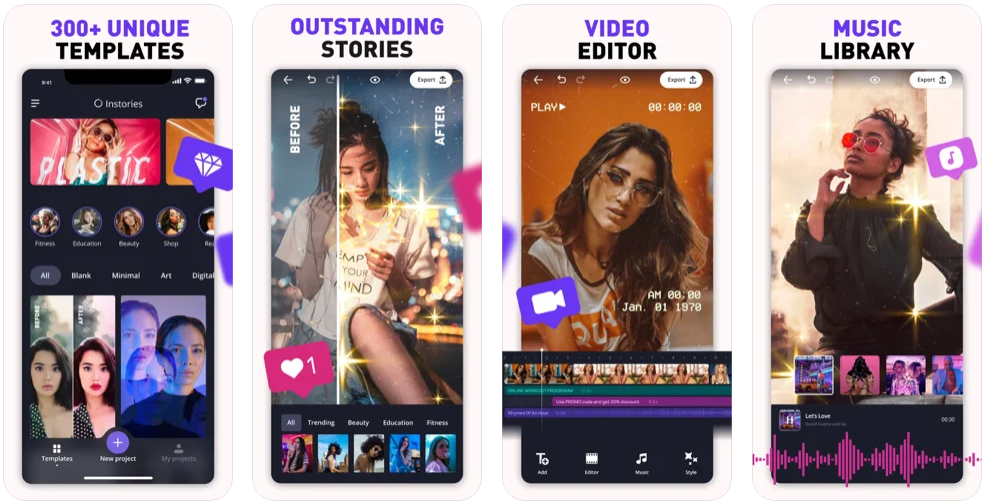 В нём есть всё необходимое для создания качественных сториз — сотни анимированных шаблонов, которые подойдут для любого контента.