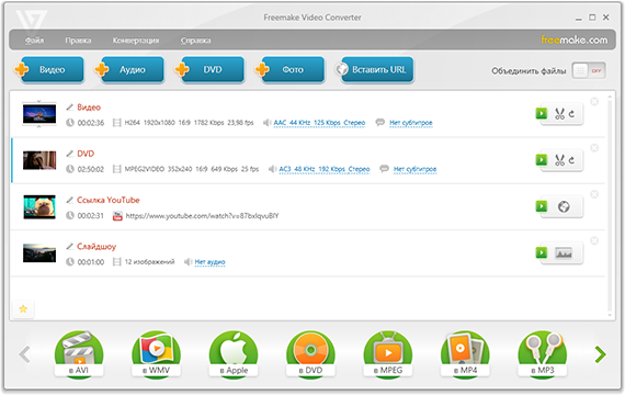 Freemake Video Converter — бесплатная программа для преобразования видео в нужное расширение. Есть русскоязычная версия интерфейса, много дополнительных опций. Разработан простой редактор. Внедрена функция воспроизведения готового видео на Blu-ray и DVD. Есть большая база поддерживаемых форматов (около 200 расширений). Можно скачивать через программу любые видеоролики из YouTube и ВКонтакте.