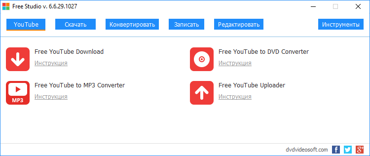 Free Studio — бесплатный видеоконвертер для работы с ОС от Microsoft. Состоит из множества инструментов для конвертации, видеоредактирования, скачивания контента из интернета. Можно загрузить видео с YouTube, конвертировать его в нужный формат, а затем отправить файл на свой смартфон. Также программа может передавать файлы на YouTube. Преимущество программы — наличие русскоязычной поддержки меню, недостаток — иногда в нём встречаются ошибки.