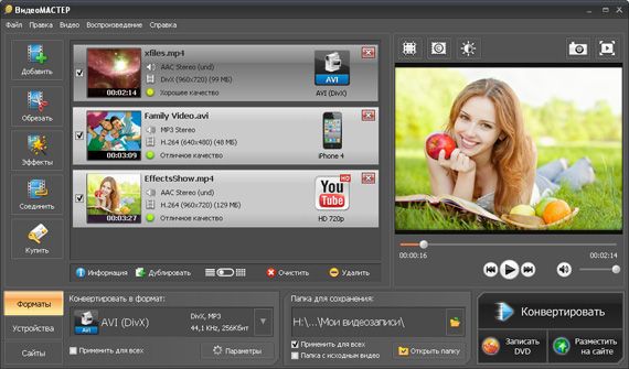 ВидеоМАСТЕР — уникальная программа для преобразования и форматирования видеофайлов. В отличие от других программ, этот универсальный конвертер может работать с любым форматом аудио- и видеодорожек. Помимо этого, программа позволяет обрезать видео, добавить к нему любой эффект, фильтр и титры.