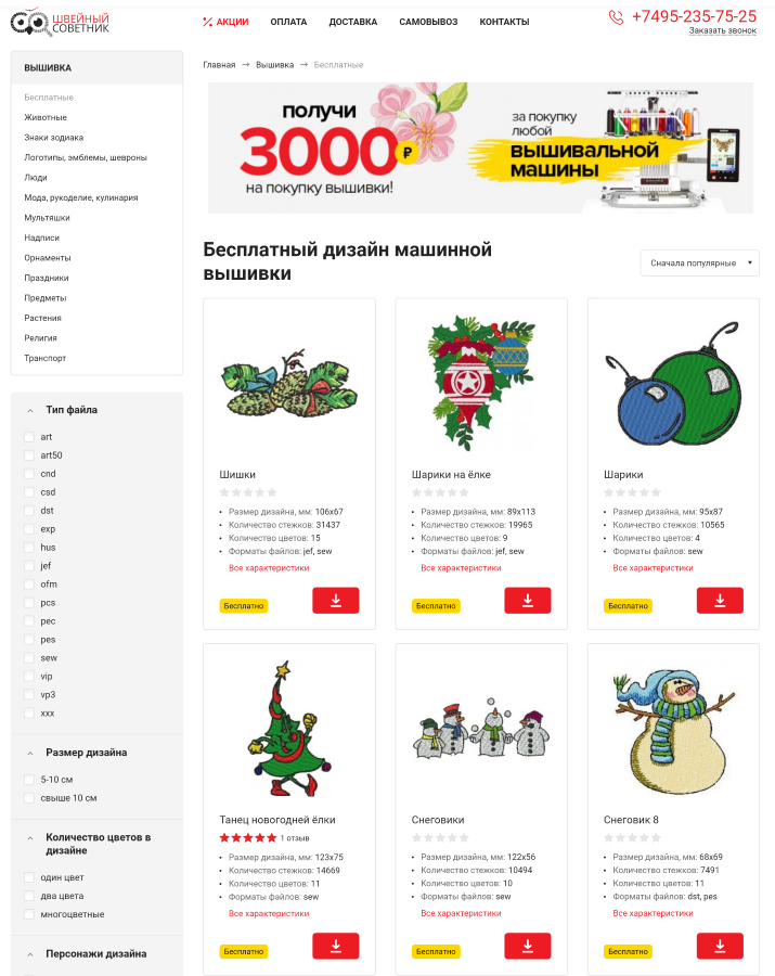 Просто огромный, по сравнению с аналогами, каталог бесплатных и платных дизайнов для машинной вышивки. Ориентироваться по каталогу можно с помощью поиска и гибкого фильтра по любым параметрам вышивки.