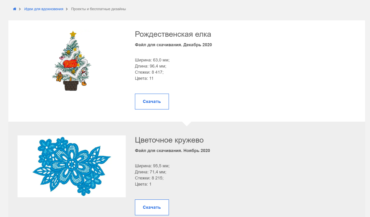 Сайт производителя популярных швейных машинок предоставляет небольшой бесплатный каталог дизайнов. По сравнению с аналогами, набор действительно скудный, а также нет возможности поиска.