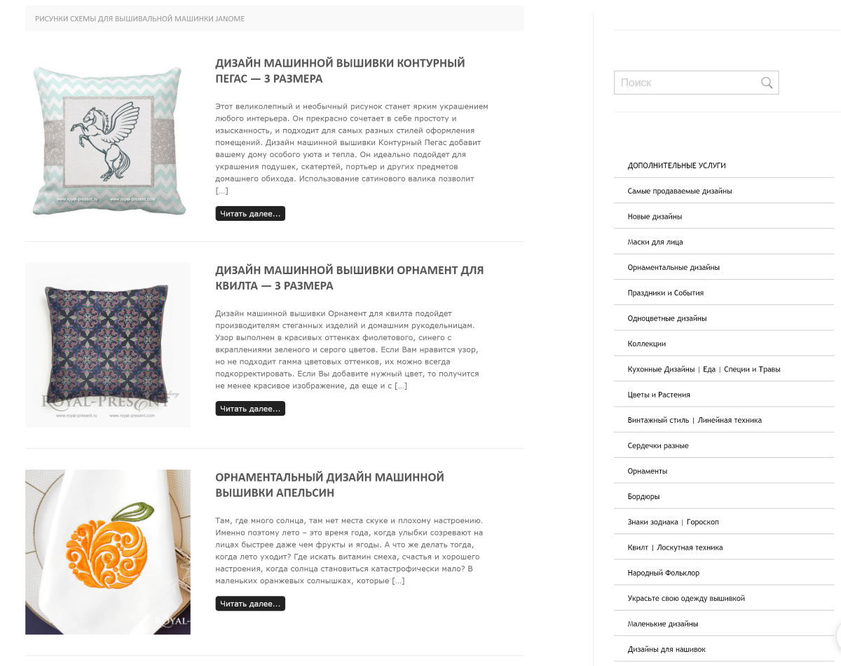 На сайте представлен довольно большой каталог дизайнов для машинной вышивки. Есть бесплатные и платные варианты. У каждого дизайна есть пример готовой работы и развёрнутое описание.