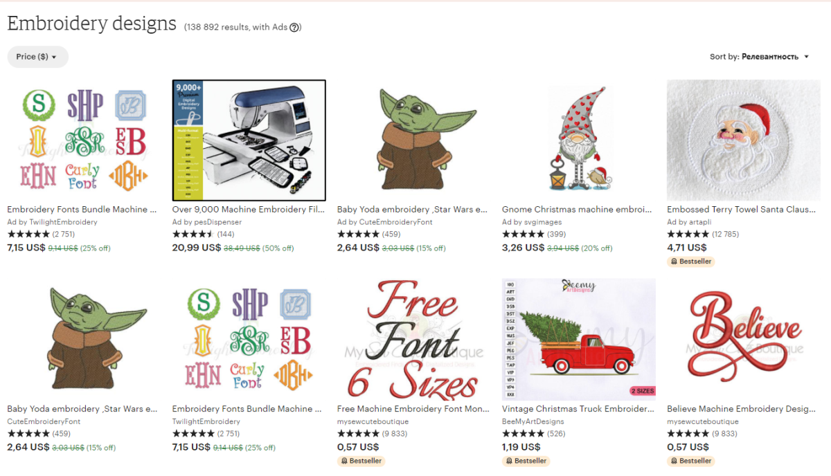 Etsy — популярный сайт для рукодельников всех мастей, а значит, для машинистов тоже найдётся свой раздел. Здесь можно купить уникальные авторские дизайны практически по любому поводу или параметру. Либо можно заказать у автора работу под ваши требования.