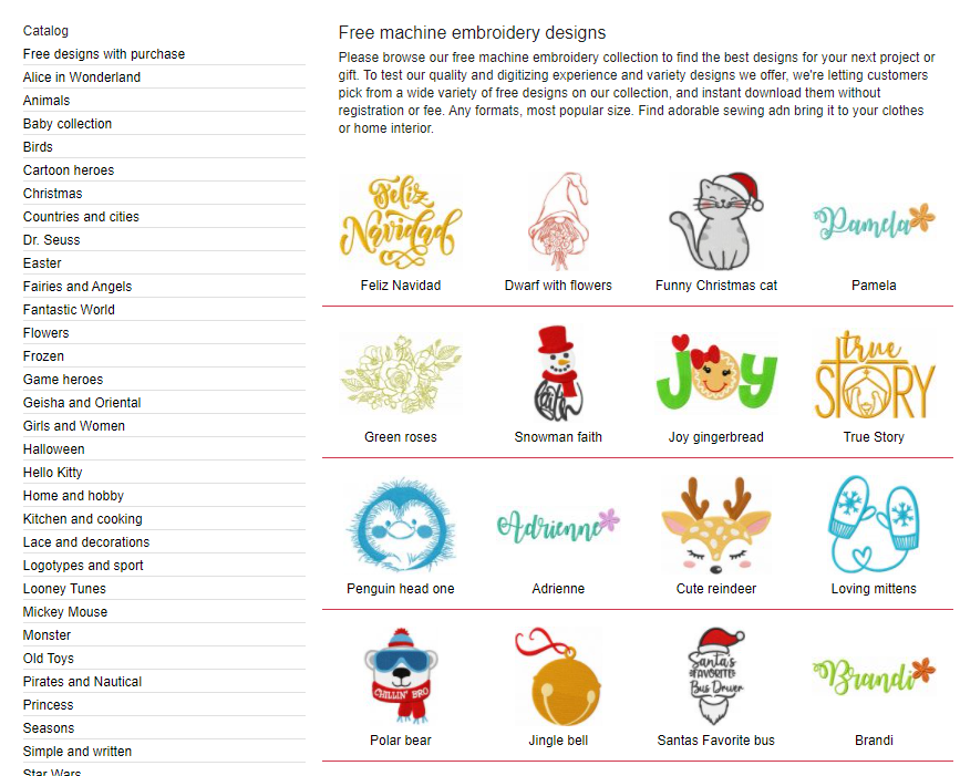 К сожалению, вместе с этим сайтом заканчиваются русскоязычные ресурсы. Зато Free Embroidery Design предлагает только бесплатные и при этом крутые дизайны с разбивкой на десяток тематик (в каждой — от десятка до сотни вариантов).