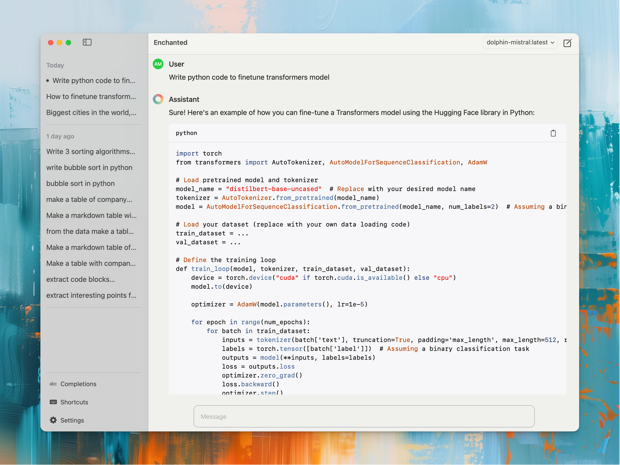 Довольно популярный веб-интерфейс, который позволяет генерировать текст, изображения, музыку, отладить код и делать многое другое. Интерфейс легко интегрируется с репозиторием GitHub и автоматически устанавливается на Linux с помощью скрипта.