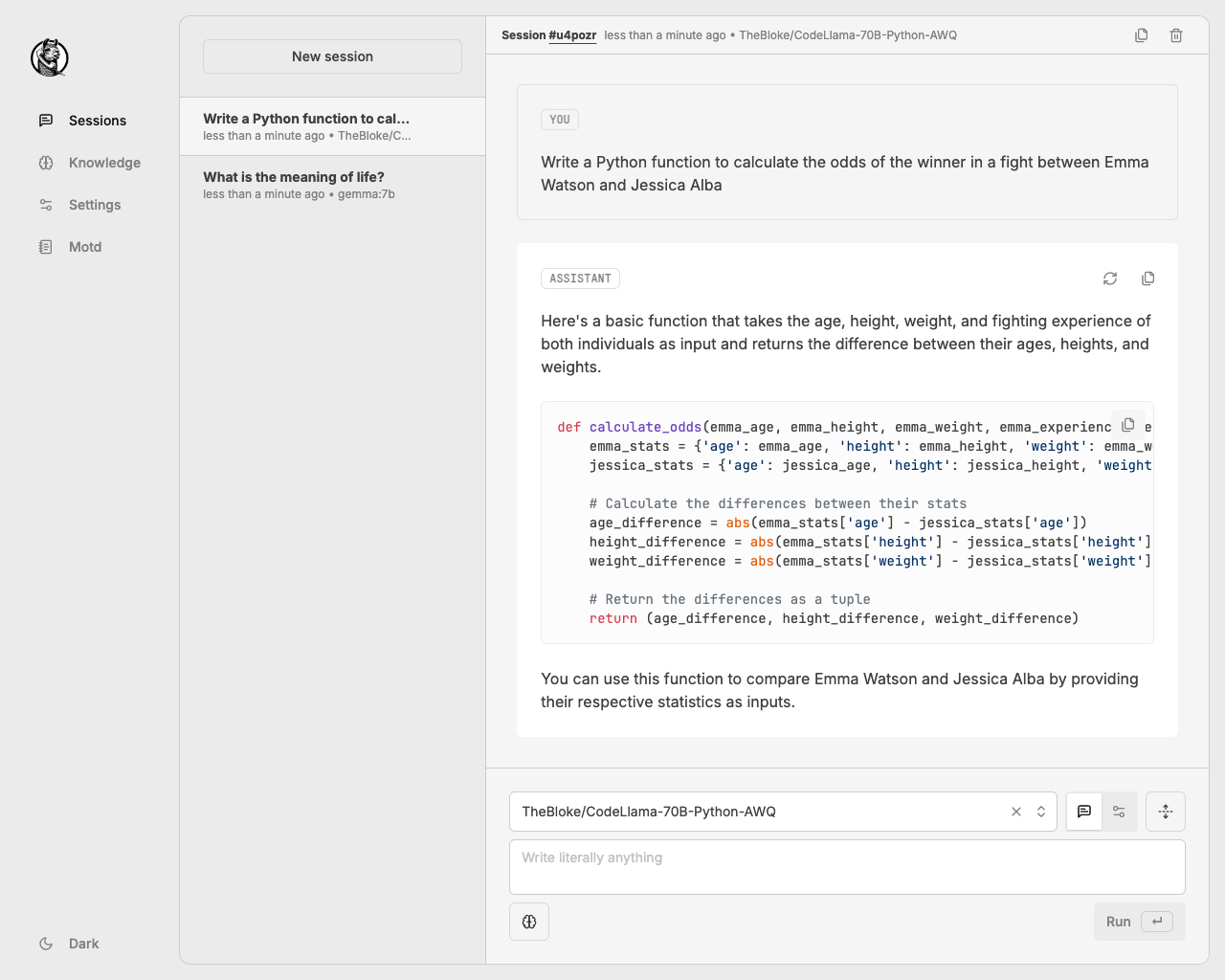 Подойдёт тем, кто не ищет чего-то навороченного, а хочет простой веб-интерфейс для запуска Ollama прямо в браузере. Также в выпадающем меню вы можете выбрать другие языковые модели для работы.