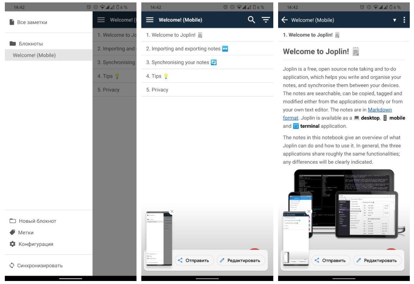 Практически полный аналог Evernote, только бесплатный. Вы можете синхронизировать свои заметки на нескольких устройствах. Есть поддержка Markdown и возможность импортировать заметки из Evernote (не напрямую).