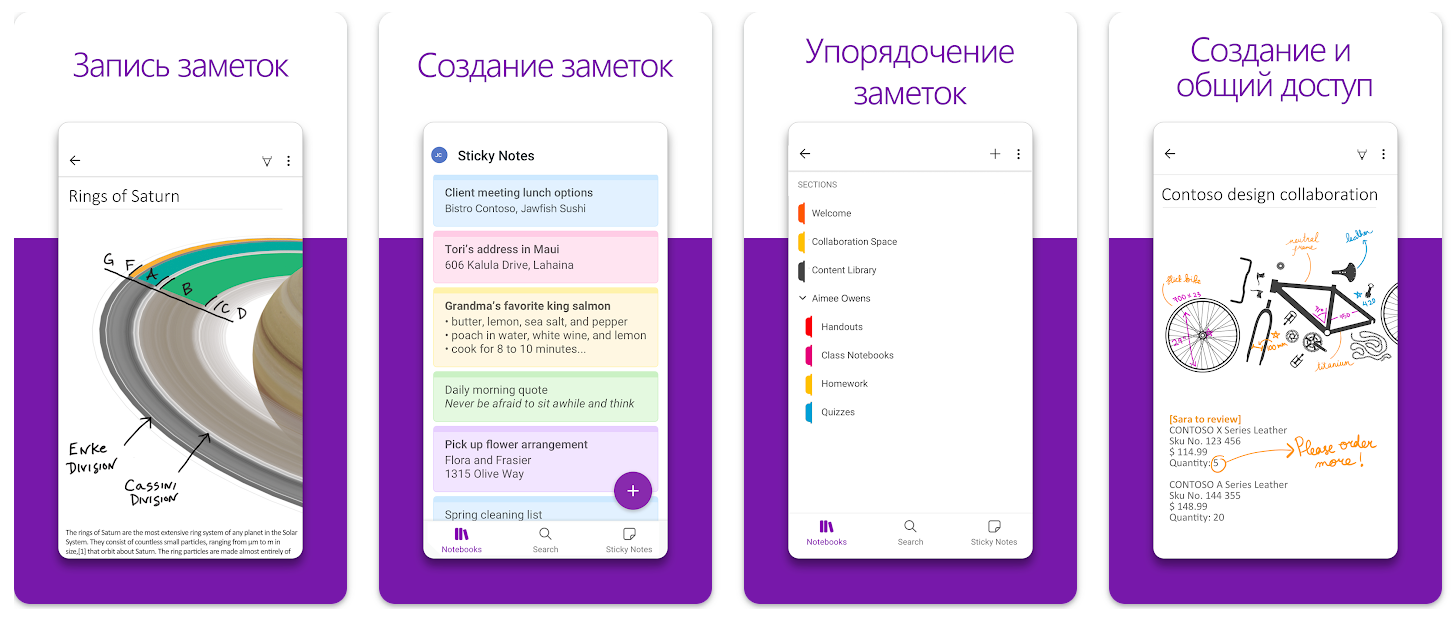 Неплохой заметочник от Microsoft. Вы сможете добавлять к своим заметкам теги, прикреплять к ним фото, видео и другие файлы, рисовать прямо на заметках, приглашать других пользователей для совместной работы в приложении и многое другое.