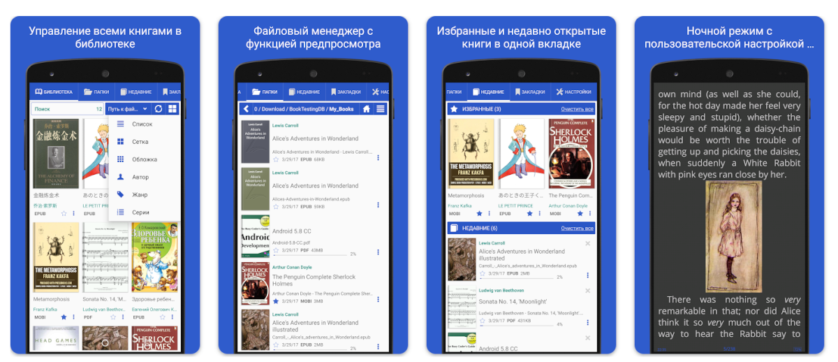 Из фишек я бы выделил современный интерфейс и два режима: один для чтения в ночное время, другой — в дневное. Также есть очень полезная функция Text-To-Speech, которая позволит прослушивать книги.