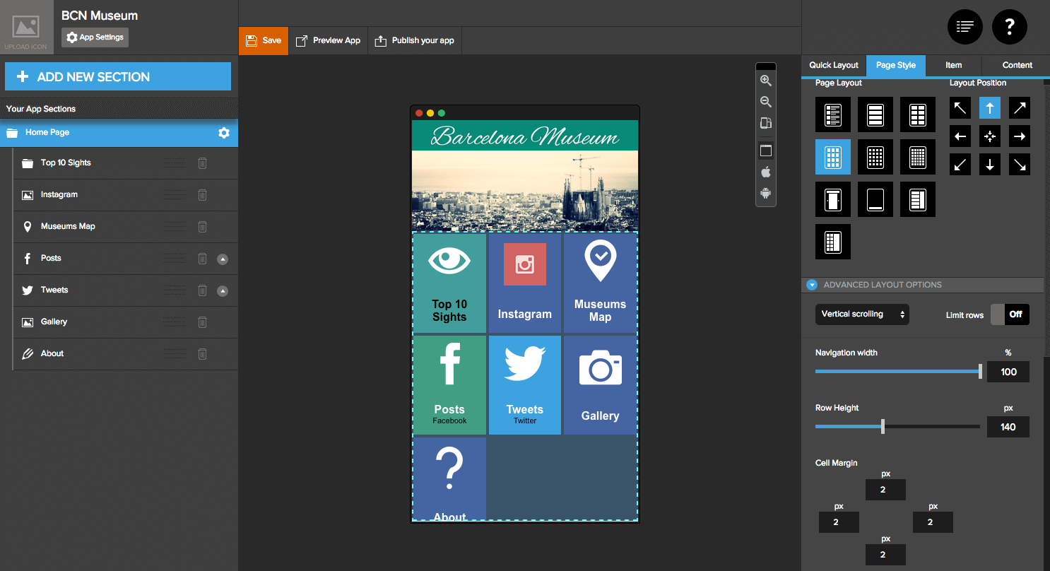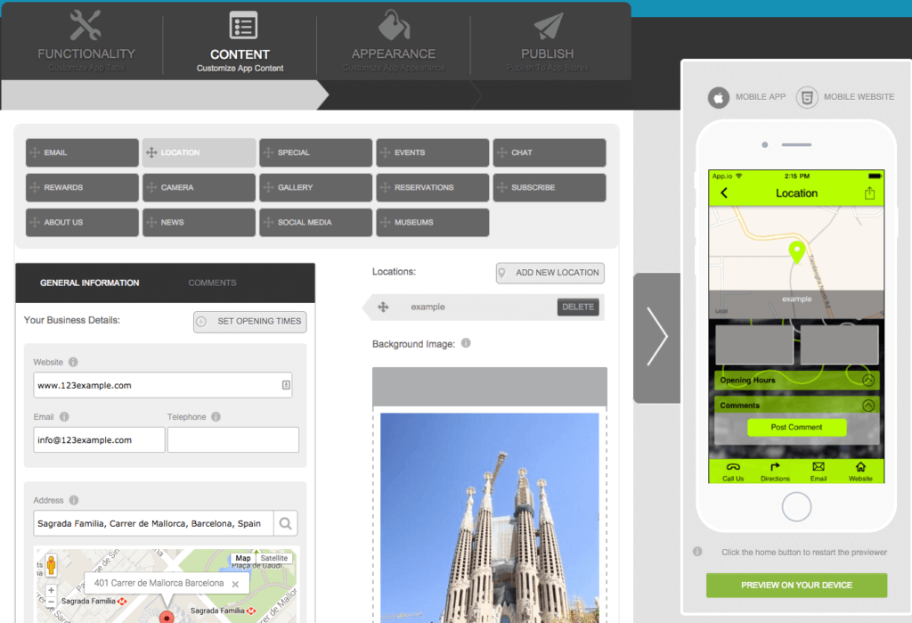 Здесь можно сделать мобильные приложения для таких операционок, как iOS, Android, Windows Phone, а ещё можно делать HTML5-приложения. Кроме того, есть возможность запилить адаптивный сайт, который автоматом синхронизирует контент вашего приложения (сейчас эта функция в стадии открытого бета-тестирования).