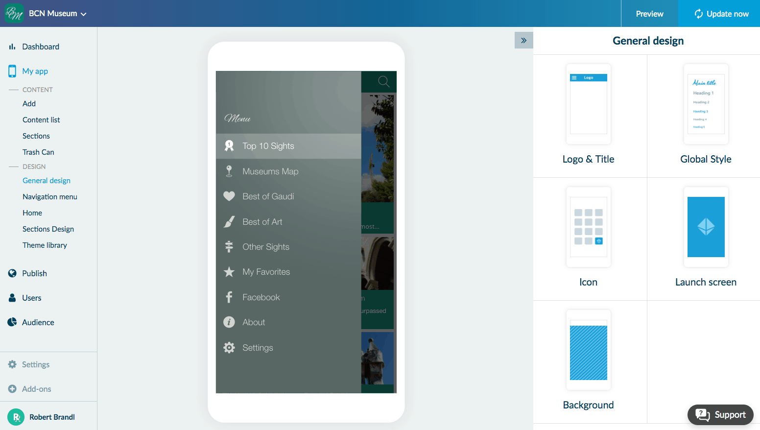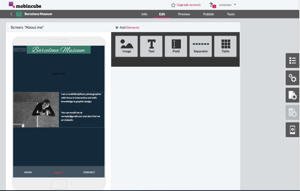 Маловато шаблонов, но зато есть очень удобный редактор и понятные описания модулей (без лишней технической терминологии). Прикольно задуман сам процесс создания приложения — вы просто добавляете нужные фишки в боковое окошко, которое выглядит как телефон, и смотрите, как это будет выглядеть. Но есть и некоторые проблемы, например, нужно помучиться, чтобы поменять какие-то элементы модуля.