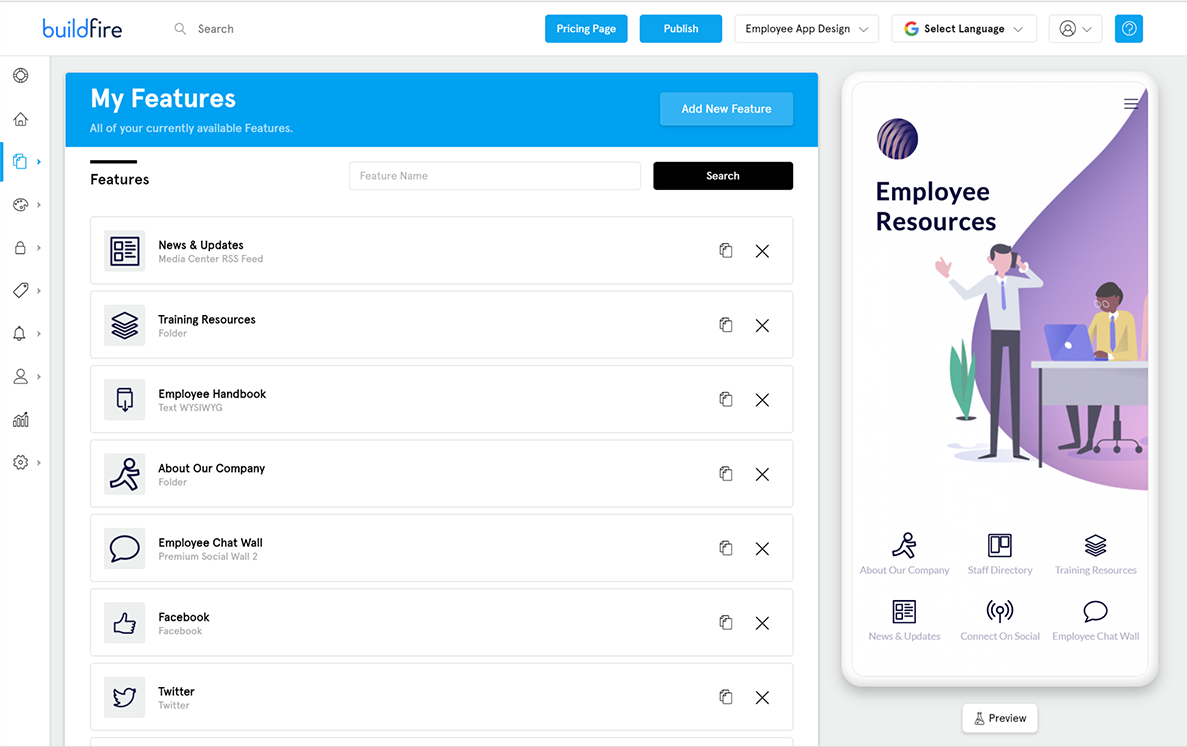 Здесь очень красивые шаблоны с различными вариантами настройки, что позволяет создавать действительно классные приложения. Есть Social Wall — место, где пользователи могут обмениваться мнениями и делиться фотками.