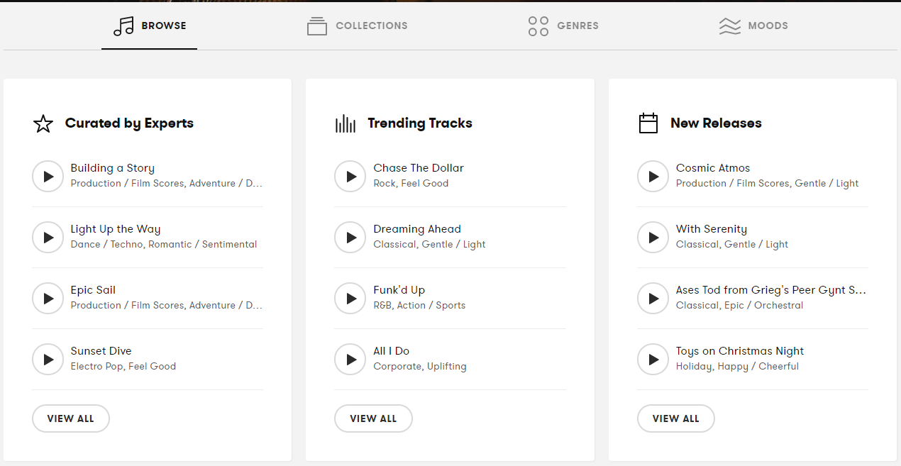 Навигация немного неуклюжая, если сравнивать с другими вышеупомянутыми сайтами. Вы можете либо искать нужный вам тип музыки, либо воспользоваться рядом подсказок, в которых вас попросят выбрать определённое настроение, жанры и инструменты, прежде чем появятся предложения. Цены зависят от вида выбранной подписки: 79$ в месяц или 149$ в год. Стоимость специальных корпоративных подписок определяется в индивидуальном порядке.