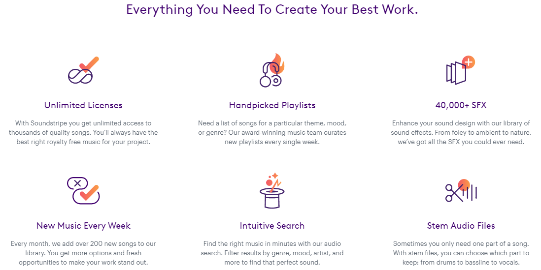 Если бы существовал приз за лучший музыкальный сайт без роялти, то его завоевал бы Soundstripe. Этот сайт — нечто большее, чем просто ёмкое название. Soundstripe отличается от сайтов, о которых мы упоминали ранее, тем, что он предлагает услугу подписки, а не возможность приобретения отдельных лицензионных треков. Фактически это означает, что ваше членство позволяет вам получить полный доступ к их тщательно подобранной музыкальной коллекции.