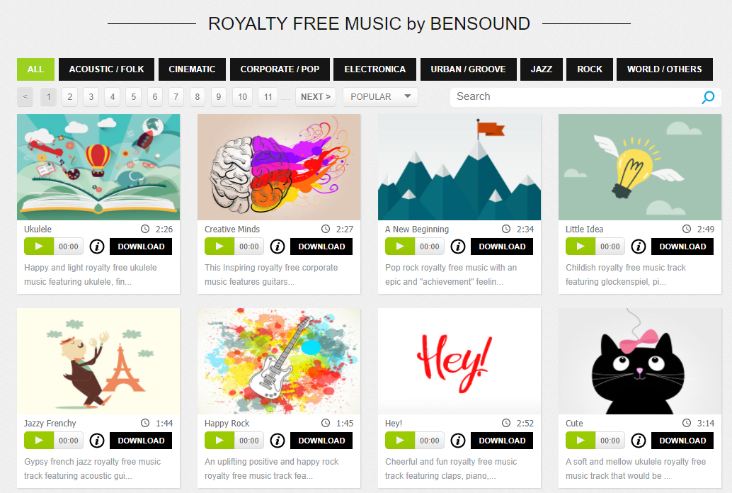 Отличный бонус заключается в том, что если вы указываете Bensound.com в качестве источника музыки, используемой в онлайн-видео или на сайтах, вы можете использовать определённые треки бесплатно по лицензии Creative Commons. Если вам такой вариант не подходит или вам нужно немного больше возможностей, вы можете купить стандартную годовую подписку за 129€ или платить от 24€ за трек по приобретённой лицензии.