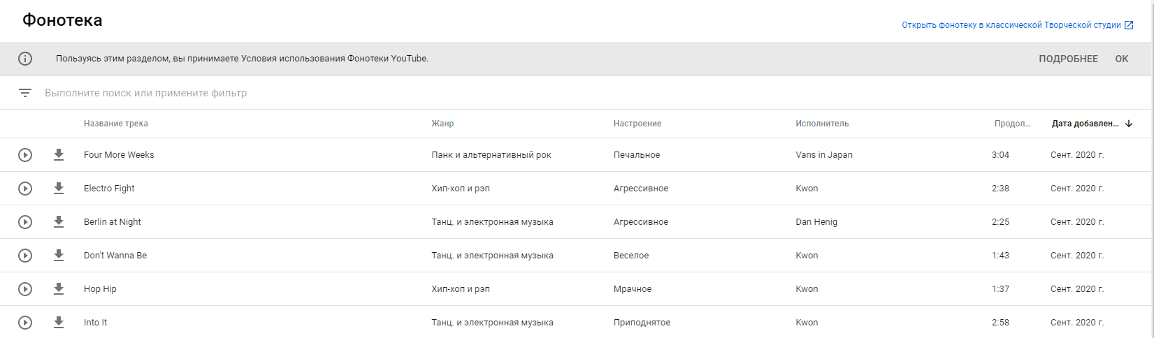 Чего ожидать от такого видеогиганта, как YouTube? А он предлагает множество бесплатных (да, вы не ослышались — бесплатных!) треков и звуковых эффектов на выбор. Нечасто случается, чтобы многонациональная компания с многомиллиардным оборотом предлагала халяву, так что это настоящая золотая жила для тех, кто создаёт короткие видеоролики и при этом имеет очень ограниченный бюджет.