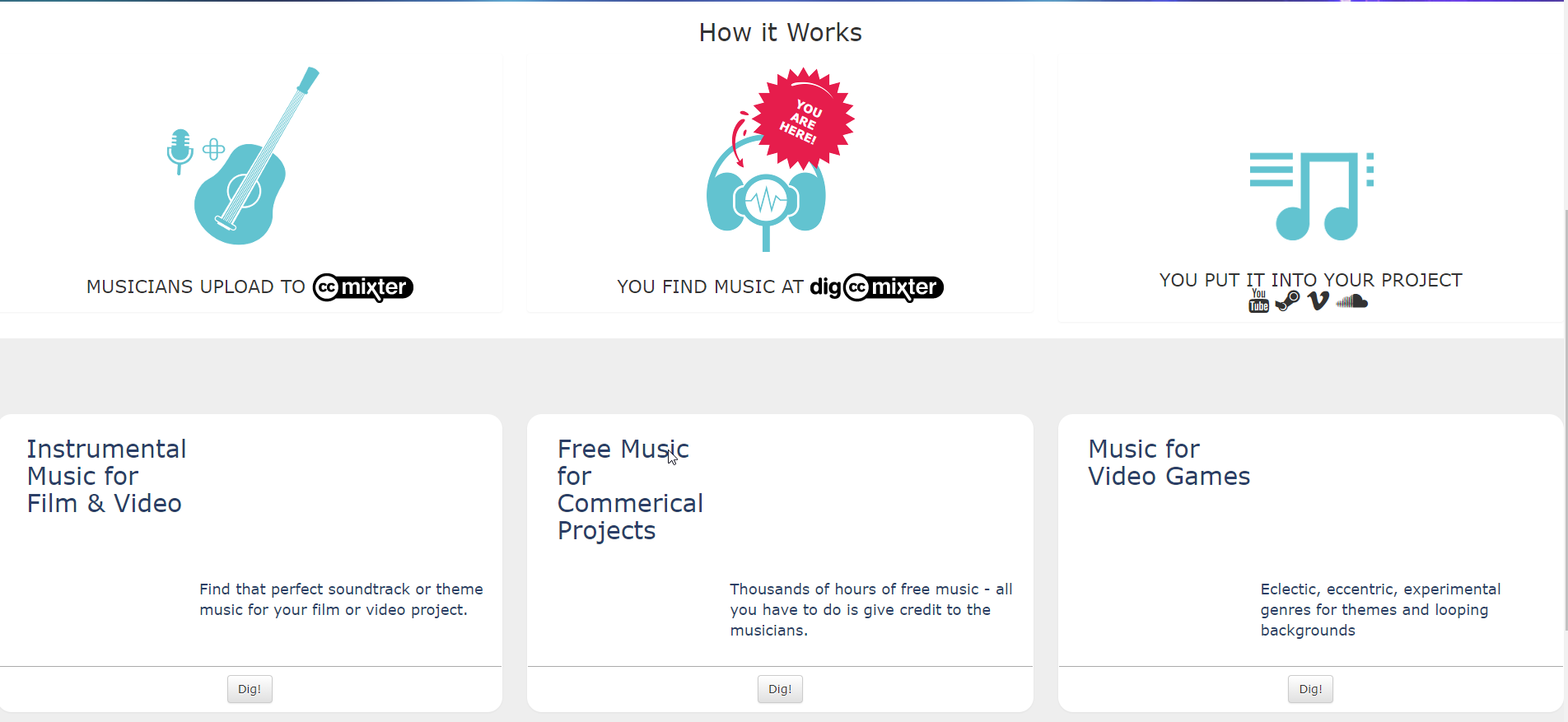 dig ccMixter — красивый сайт с привлекательными иконками и потрясающей надписью на входе «У вас уже есть разрешение». Но это не главное. Главное же заключается в том, что dig ccMixter даёт вам доступ к тысячам часам музыки, в том числе к множеству инструментальных мелодий, идеально подходящих для оформления видеоигр.