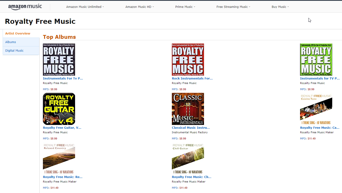 Если вы знакомы с платформой Amazon (в конце концов, кто не слышал об Amazon в наши дни?), то вы точно знаете, чего ожидать от этого гиганта. Ассортимент представленных здесь треков не особо впечатляющий (Amazon собрал на своём сайте 1019 треков, не требующих лицензионных отчислений), но зато цена на royalty-free-музыку почти не отличается от цены обычного трека для скачивания. Навигация по сайту, по правде говоря, немного разочаровала.
