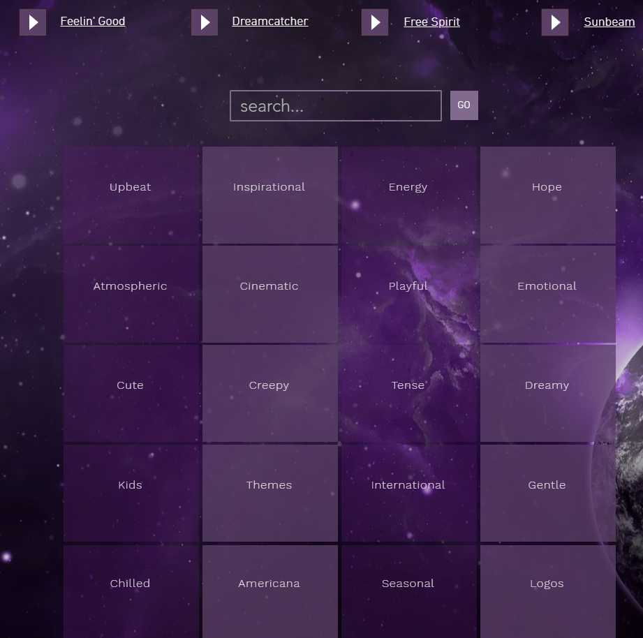 Как и следовало ожидать от сайта с таким названием, Purple Planet действительно фиолетовый и напоминает планетарий. Что нам понравилось в этом сайте, так это то, как они разделили жанры — «Как звучит музыка» и «Как она заставляет вас чувствовать». Так что вам предстоит осуществлять выбор не между роком, поп или кантри, как это обычно бывает, а между «Активная», «Жуткая» или «Милая»! Хотя выбор бесплатных загрузок несколько своеобразный, эти треки можно свободно использовать в небольших коммерческих проектах, таких как видео на YouTube.