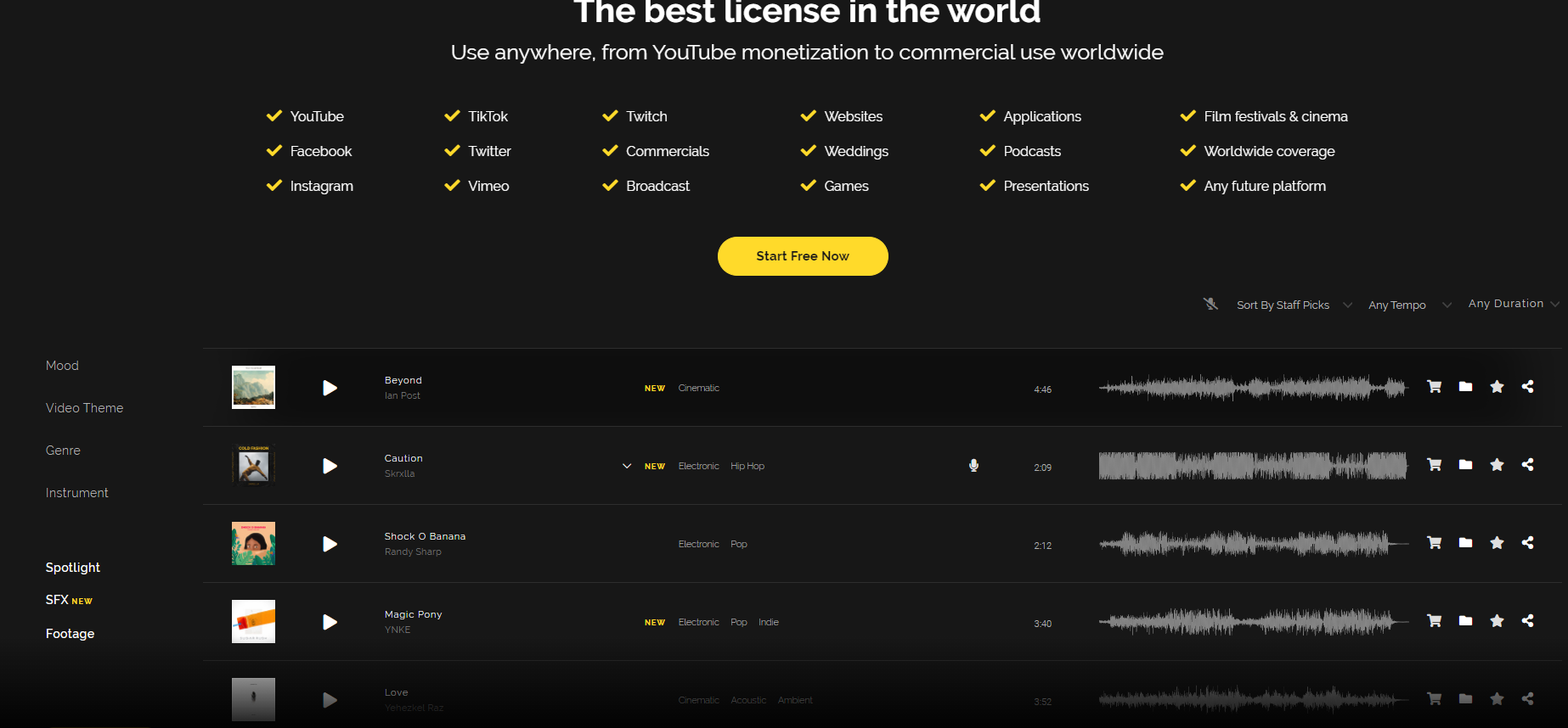 Epidemic Sound, безусловно, является одним из наиболее доступных сайтов с музыкальным контентом, не требующим лицензионных платежей, и обширной библиотекой мелодий.