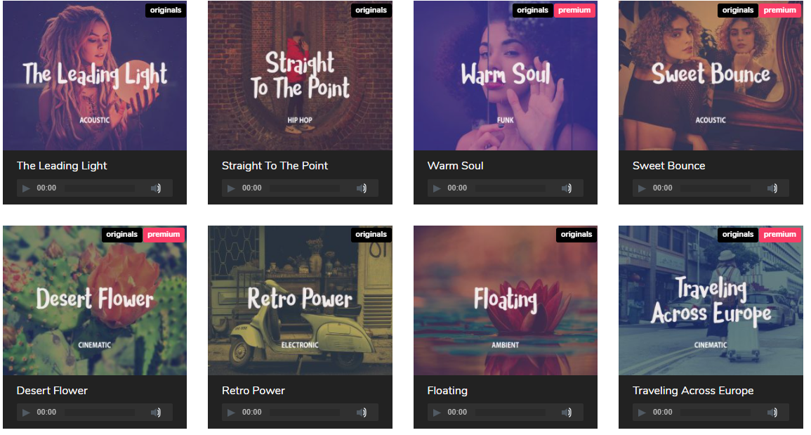 На сайте PremiumBeat, дочерней компании глобальной библиотеки изображений Shutterstock, легко ориентироваться, поэтому вы можете быстро найти то, что ищете. Их библиотека royalty-free-музыки, подобранная настоящими экспертами, подарит вам ощущение безупречности, которое вы обычно получаете от работы крупных продюсерских компаний. Все треки эксклюзивны и защищены авторскими правами.