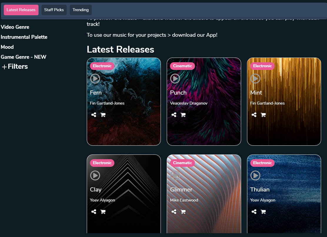 Этот «оазис великолепной музыки» появился относительно недавно: проект был запущен в Великобритании в 2015 году. Его коллекция в настоящее время ограничена 2062 треками от 146 исполнителей. Однако пусть это вас не смущает, потому что Music Vine ставит качество превыше количества, предлагая треки, в которых есть «реальное исполнение, реальные инструменты и реальные эмоции». Сайт прост в навигации, а его тщательно подобранные и визуально приятно оформленные библиотеки разделены по жанрам, настроениям, инструментам и продолжительности.